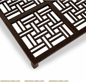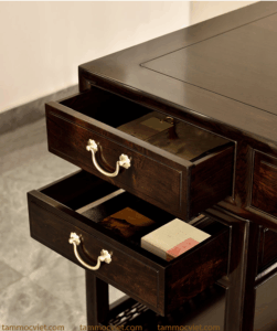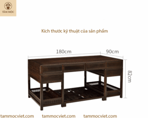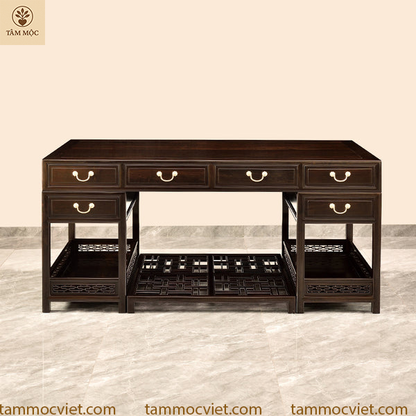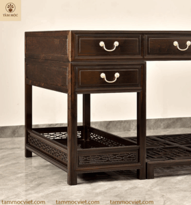 Thiết kế: Mặt bàn rộng rãi, hệ thống 6 ngăn kéo nhỏ gọn; tầng dưới trang trí bằng nan gỗ cách điệu cổ truyền.