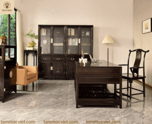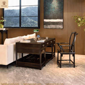 Sự kết hợp giữa bàn làm việc gỗ trắc cao cấp và ghế tai quan tạo nên một tổng thể nội thất sang trọng, phù hợp với không gian làm việc, thư phòng, hoặc phòng tiếp khách theo phong cách truyền thống.