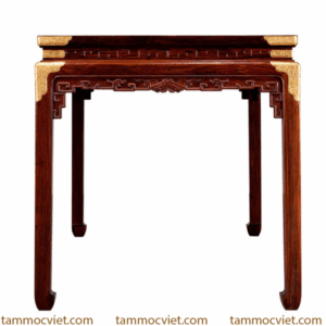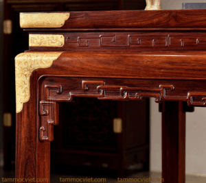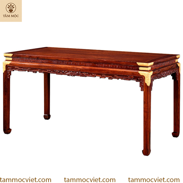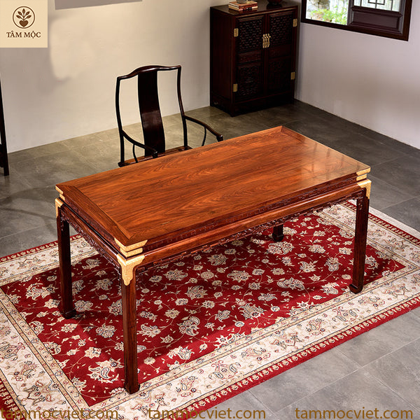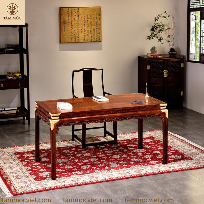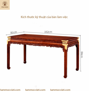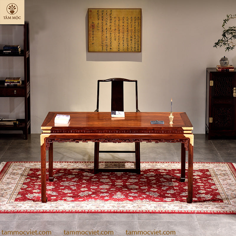 Với kích thước tiêu chuẩn: dài 162cm – rộng 81cm – cao 84cm, mẫu bàn làm việc gỗ hương cao cấp được thiết kế với khung chân chắc chắn, mặt bàn dày dặn, các chi tiết chạm khắc tỉ mỉ trên yếm bàn cùng với điểm nhấn mạ vàng tinh xảo ở các góc, tạo nên tổng thể thanh lịch, đậm chất Á Đông.