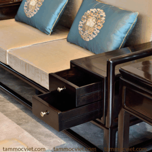 - Bàn trà đi kèm có ngăn kéo – tiện dụng – đồng bộ kiểu dáng với bộ ghế, tạo nên tổng thể thanh lịch.