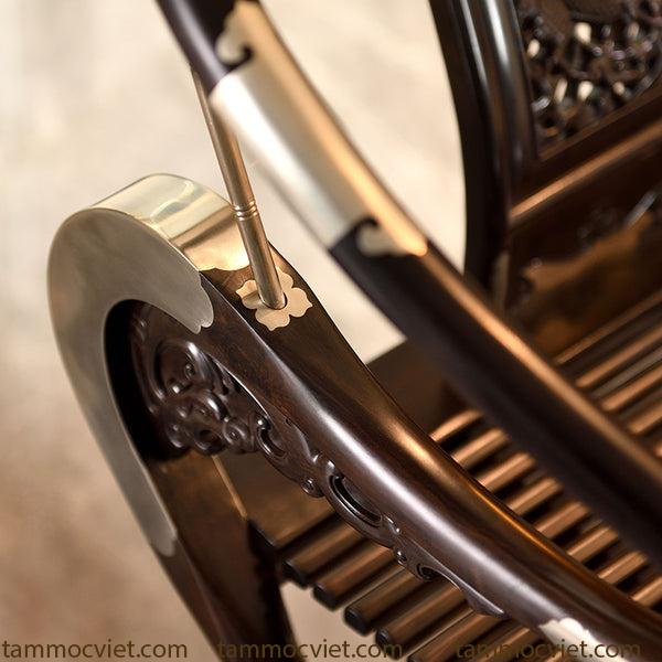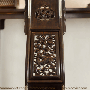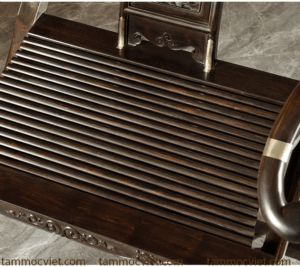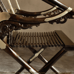 Từng chi tiết trên thân ghế đều được chạm trổ thủ công bằng tay bởi nghệ nhân lành nghề. Các hoa văn truyền thống như “vân mây”, “dây leo” hay “bát tiên” không chỉ mang tính trang trí mà còn chứa đựng ý nghĩa phong thủy sâu sắc. Sự kết hợp hài hòa giữa màu gỗ trắc và chi tiết khảm ốc tạo nên vẻ đẹp độc bản cho từng sản phẩm.