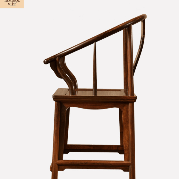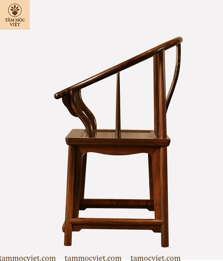 Ghế Minh Trọc gỗ trắc nổi bật với phần tay vịn uốn cong liền khối, tạo thành một vòng cung thanh thoát nhưng vẫn chắc chắn. Tựa lưng của ghế được thiết kế dạng liền, cao vừa đủ nâng đỡ cột sống, tạo cảm giác thoải mái khi ngồi lâu.