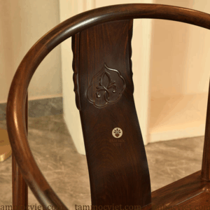 Điểm nhấn ở phần tựa lưng chính là họa tiết chạm nổi hình hoa lá cách điệu – biểu tượng cho tài lộc và phúc khí. Tất cả chi tiết đều được đục tay cẩn thận, thể hiện kỹ thuật chế tác bậc thầy của thợ mộc Tâm Mộc Việt.