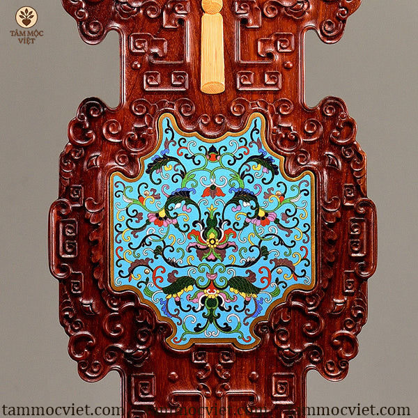 Điểm nổi bật nhất của ghế Ngũ Phúc gỗ hương khảm pháp lam chính là họa tiết khảm pháp lam đầy màu sắc. Những đường nét mềm mại, tinh tế được phối hợp hài hòa, tạo nên bức tranh nghệ thuật ngay trên phần tựa lưng ghế. Nghệ thuật này không chỉ mang giá trị thẩm mỹ mà còn thể hiện tay nghề bậc thầy của nghệ nhân.