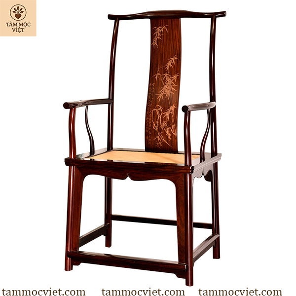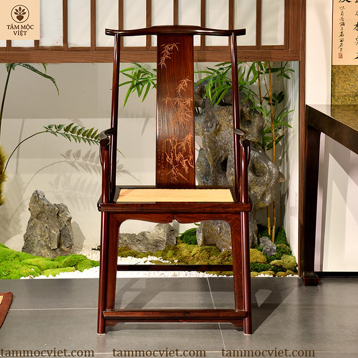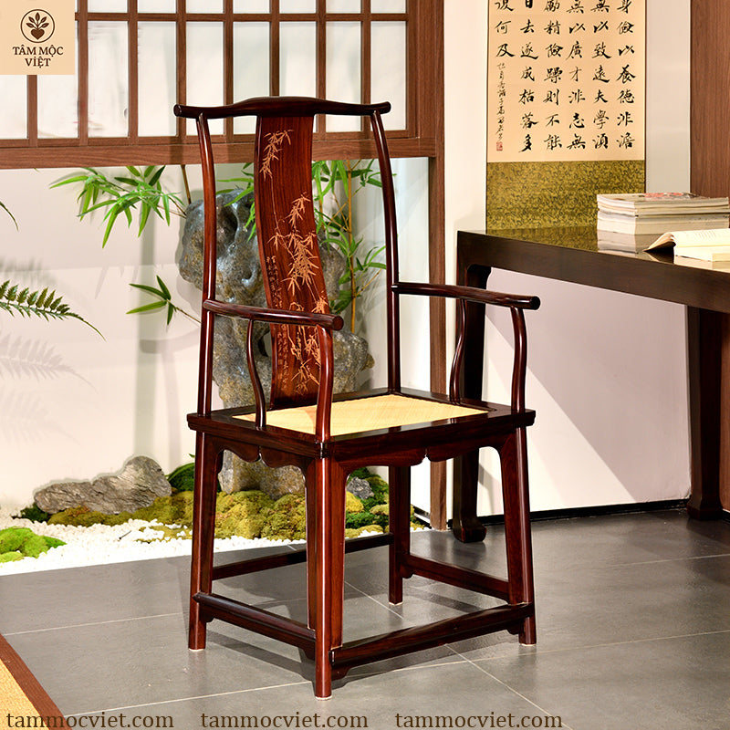 Ghế tai quan gỗ hương đục trúc không đơn thuần là một món đồ nội thất, mà còn là điểm nhấn nghệ thuật trong không gian sống. Sự kết hợp giữa khung ghế vuông vức, tay vịn cong mềm mại và tựa lưng khắc trúc sắc sảo thể hiện trình độ chế tác đỉnh cao của các nghệ nhân Tâm Mộc Việt.
