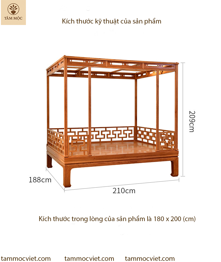 Ngoài ra, phần khung giường được thiết kế 4 trụ vững chắc cùng phần mái trang trí tạo thành dáng giường ngủ buồng cao cấp, giúp tách biệt không gian ngủ một cách kín đáo, ấm cúng mà vẫn thanh lịch.