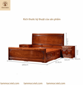 Với kích thước tổng thể 180cm x 213cm, giường ngủ gỗ hương cao cấp được thiết kế với phần đầu giường cao 113cm, tạo nên điểm nhấn thanh lịch và vững chãi. Phần chân giường và thành giường được gia công dày dặn, sắc nét với các đường nét bo vuông mạnh mẽ – toát lên phong cách cổ điển và đẳng cấp.