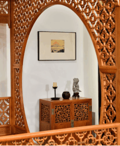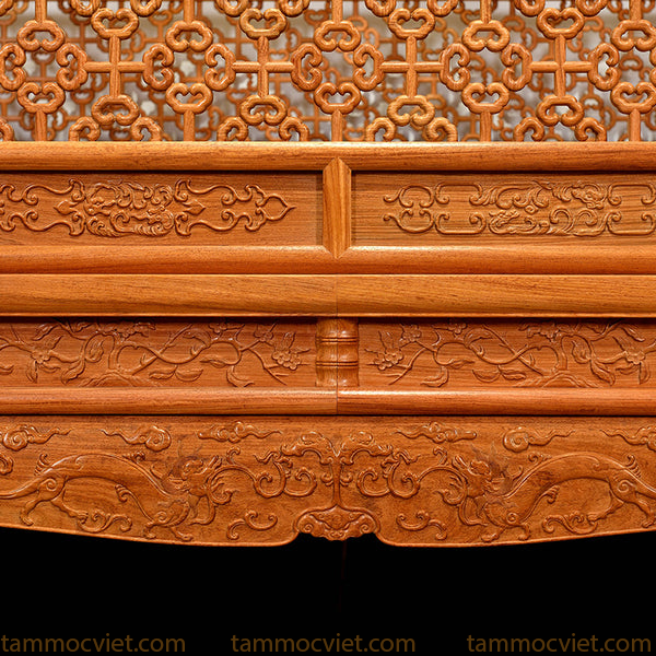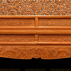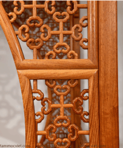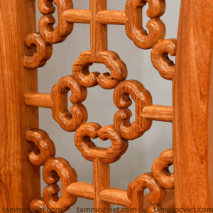 Hệ thống vách hoa văn chạm thấu với họa tiết cổ như hoa mai, hồi văn, phúc thọ… tượng trưng cho sự may mắn, phồn thịnh