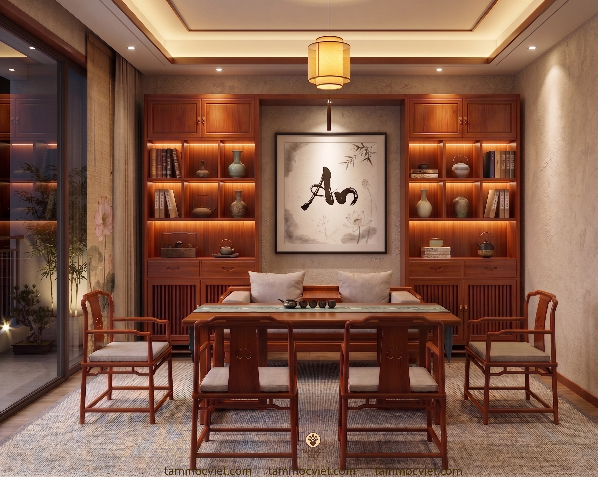 Đặc biệt, khi kết hợp với chất liệu gỗ hương, tổng thể không gian sẽ có thêm chiều sâu. Màu gỗ ấm, vân gỗ đẹp và cảm giác sang nhưng không phô chính là điểm khiến trà thất gỗ hương luôn được yêu thích trong các thiết kế mang tính thư giãn, tĩnh và bền lâu.