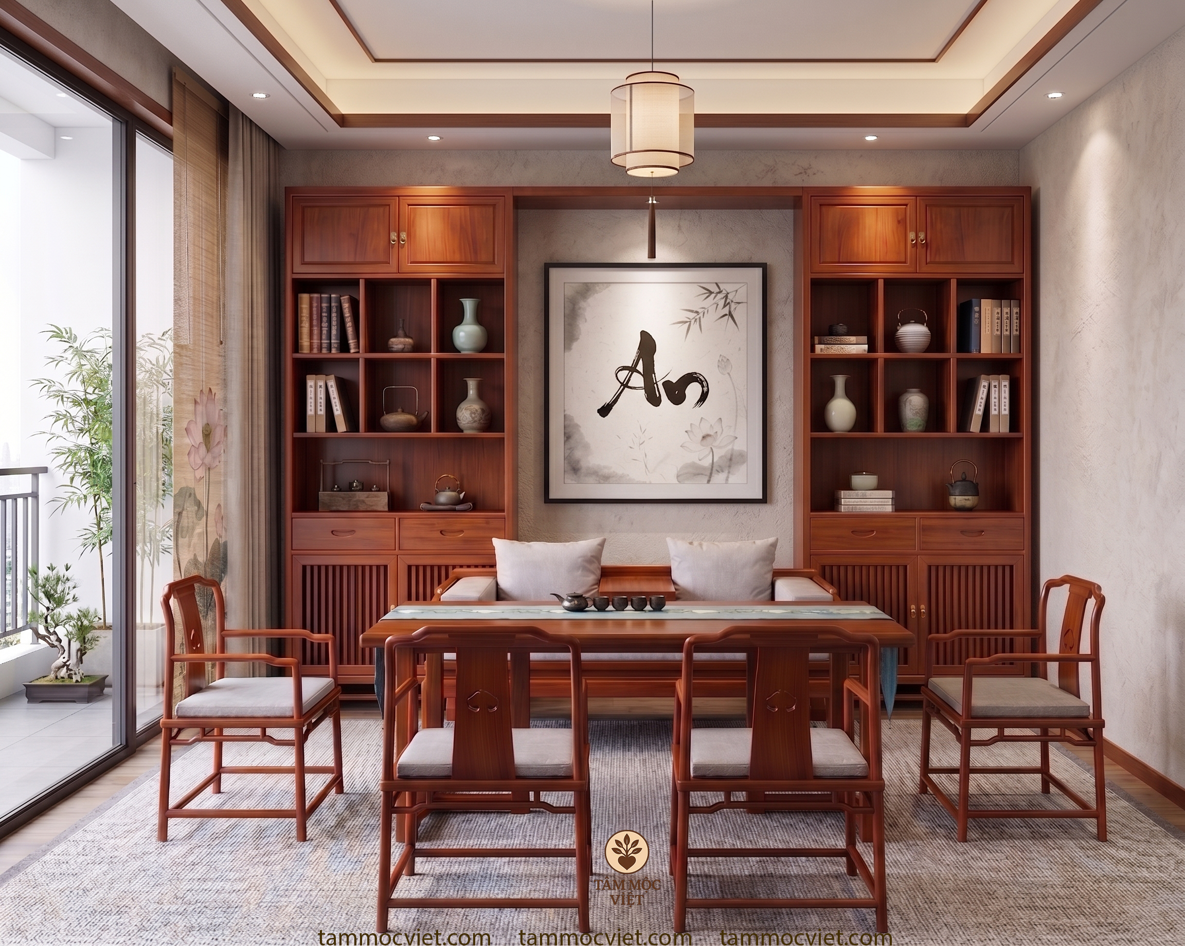 Bố cục cân đối tạo nên vẻ đẹp bền của không gian trà thất gỗ hương 15-20m2