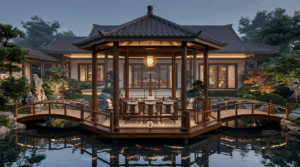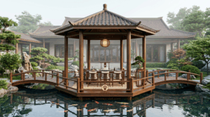 Điểm đặc biệt của lầu trà thất gỗ cao cấp nằm ở chỗ nó không cần quá phô trương nhưng vẫn đủ để người ta cảm nhận được sự chỉn chu và tinh tế. Chỉ cần một mặt hồ yên, một nhịp cầu cong, một mái lầu gỗ trầm ấm và bộ bàn trà đặt ở trung tâm, tổng thể đã tạo nên một cảm giác rất khác: tĩnh hơn, sâu hơn và có hồn hơn.