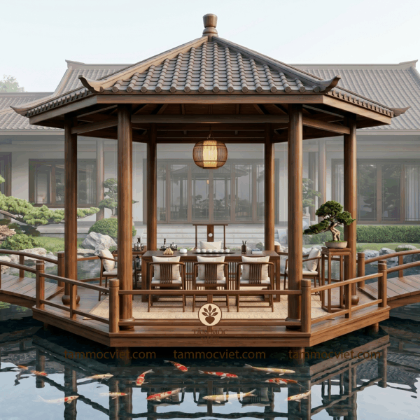 Một chi tiết rất được yêu thích trong thiết kế lầu trà thất gỗ cao cấp là việc đặt lầu giữa hồ cá koi. Giải pháp này không chỉ tăng tính thẩm mỹ mà còn giúp không gian trở nên thoáng, có chiều sâu và giàu sinh khí. Khi ánh sáng phản chiếu trên mặt nước, khi gió nhẹ lướt qua mặt hồ, khi bước chậm qua cây cầu cong để vào lầu, trải nghiệm ấy mang lại một cảm giác khó thay thế bằng những kiểu không gian thông thường khác.
