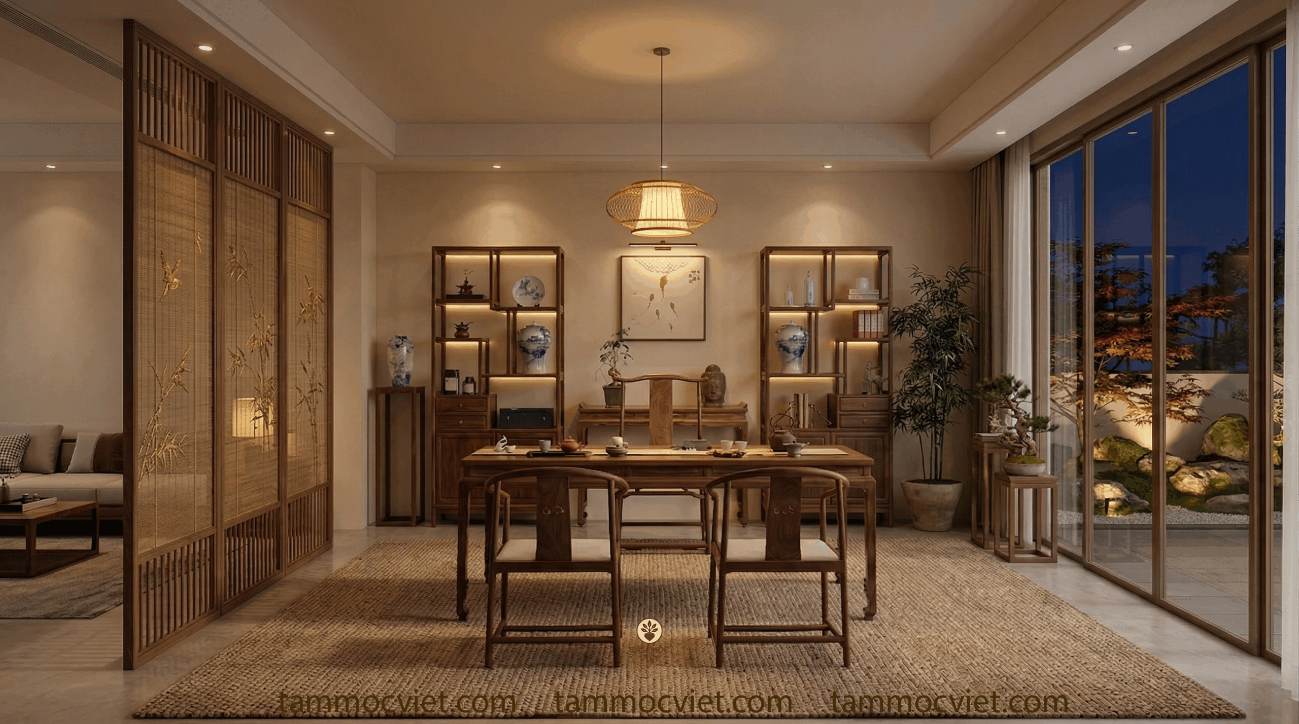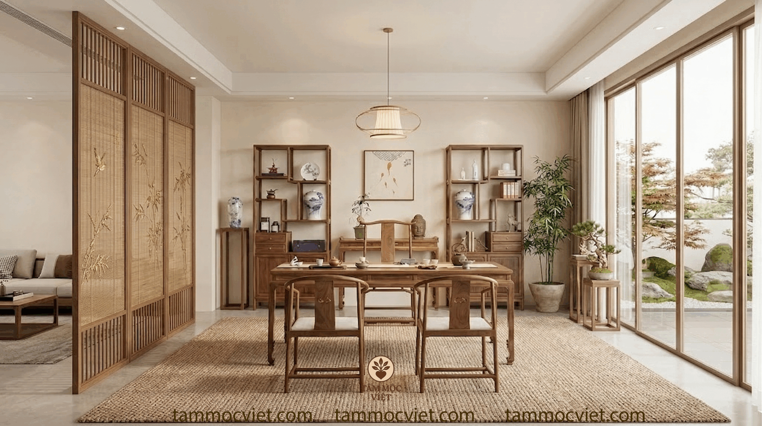 Tâm Mộc Việt – Đơn vị đồng hành hoàn thiện setup trà thất phòng khách 15-18m2