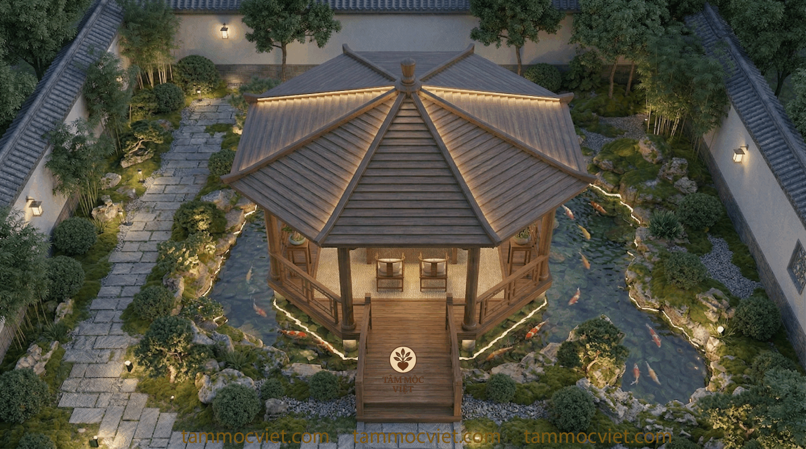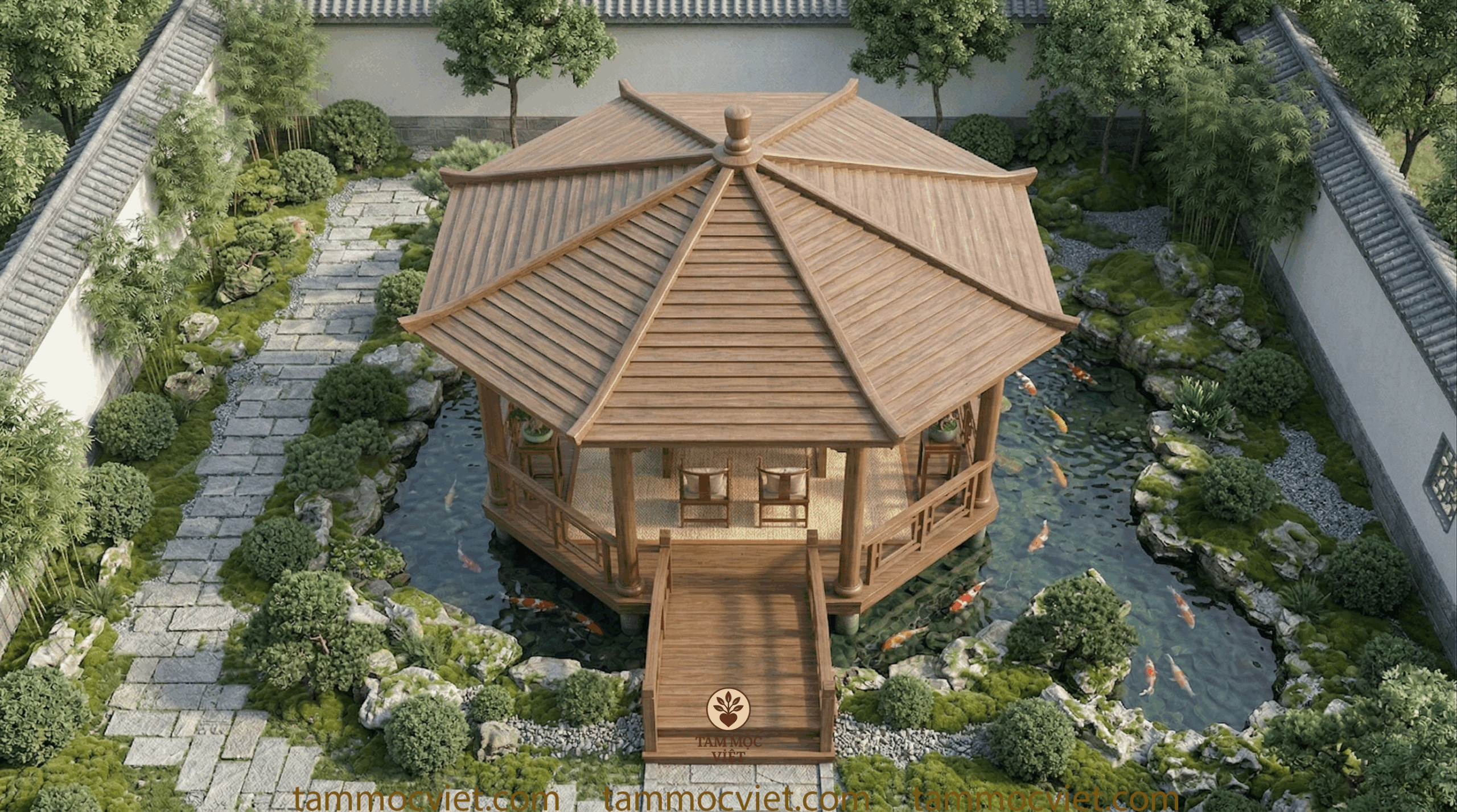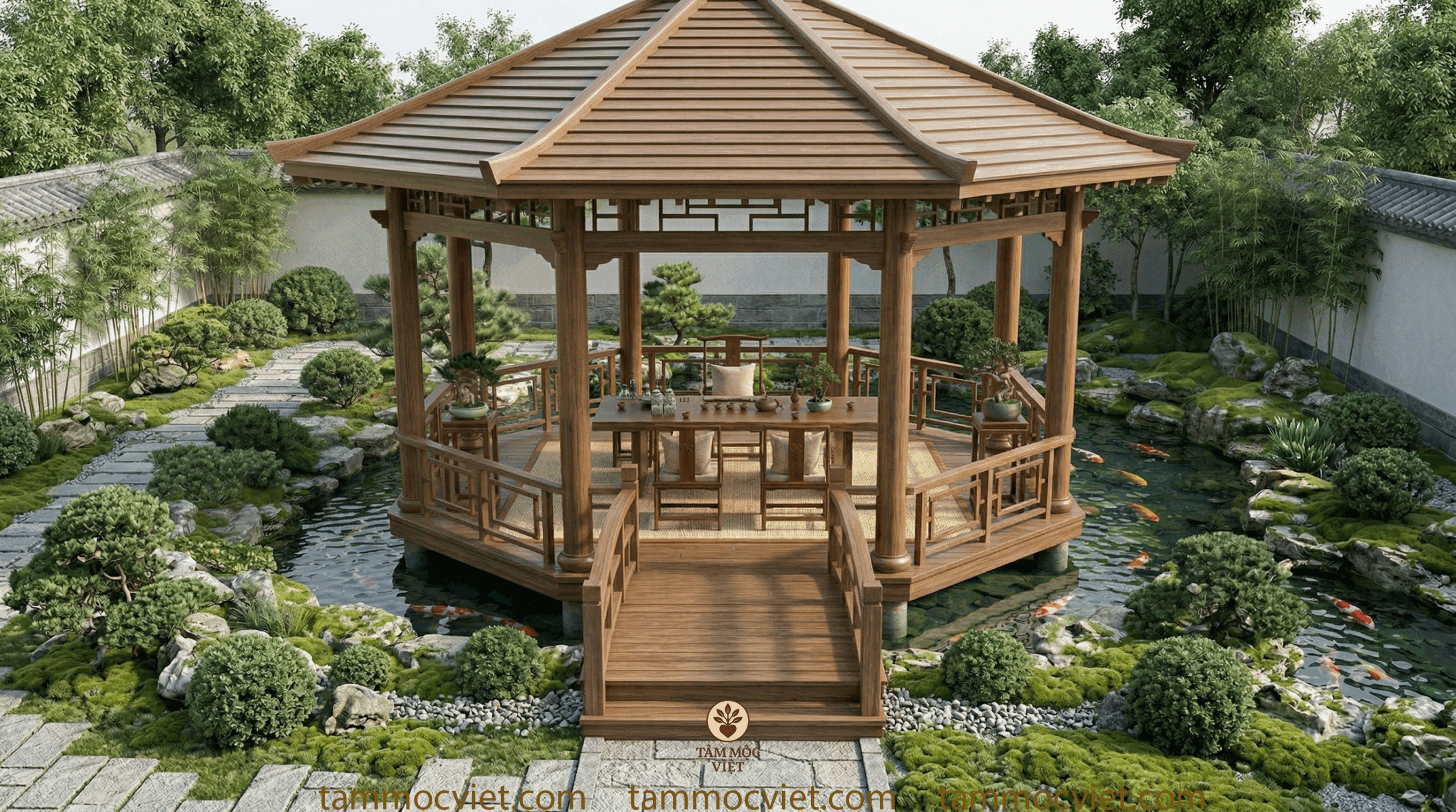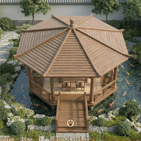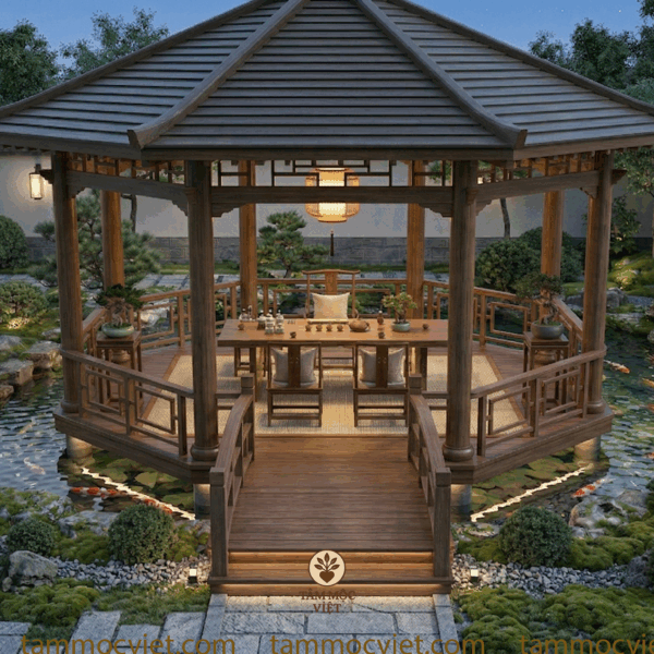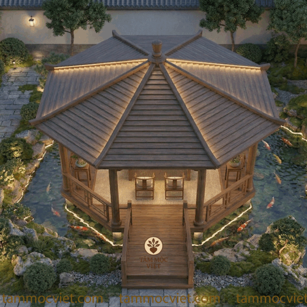 Mẫu trà thất ngoài trời do Tâm Mộc Việt định hướng lần này được thiết kế theo tinh thần thanh nhã, sang trọng và gần gũi thiên nhiên. Toàn bộ chòi trà được đặt nổi giữa hồ cá koi, kết nối bằng lối cầu gỗ dẫn vào trung tâm. Bao quanh là cây xanh, đá cảnh, rêu phủ, lối đi sân vườn và mặt nước trong mát. Tổng thể tạo nên một không gian trà đạo ngoài trời vừa có chiều sâu thẩm mỹ, vừa mang lại cảm giác thư thái ngay từ ánh nhìn đầu tiên.