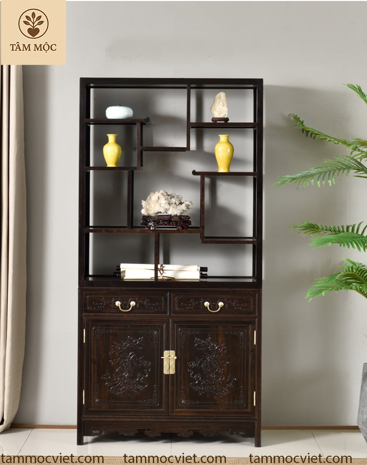 Tủ sách – Tủ bày đồ gỗ trắc chạm tứ quý | Tâm Mộc Việt