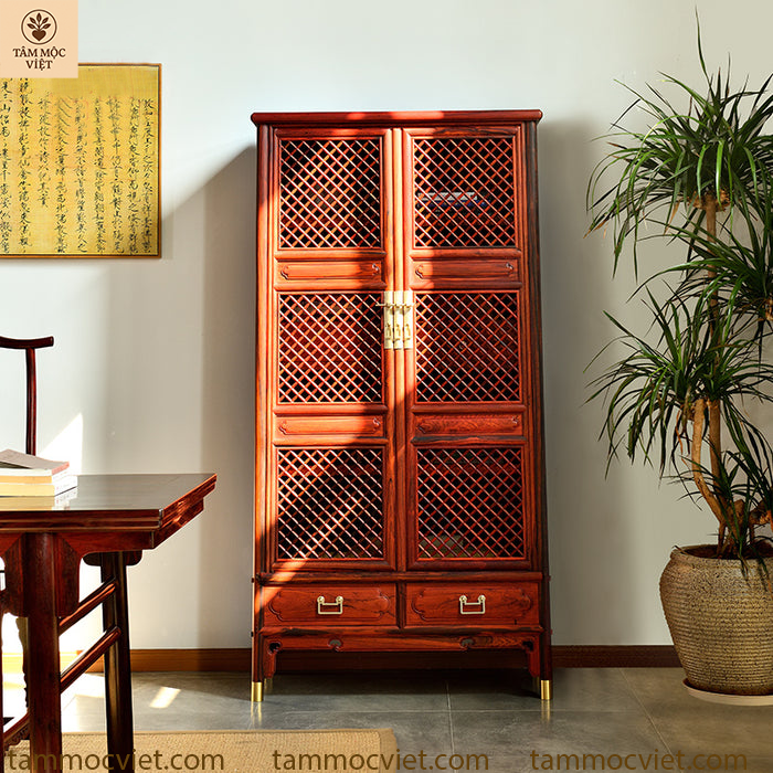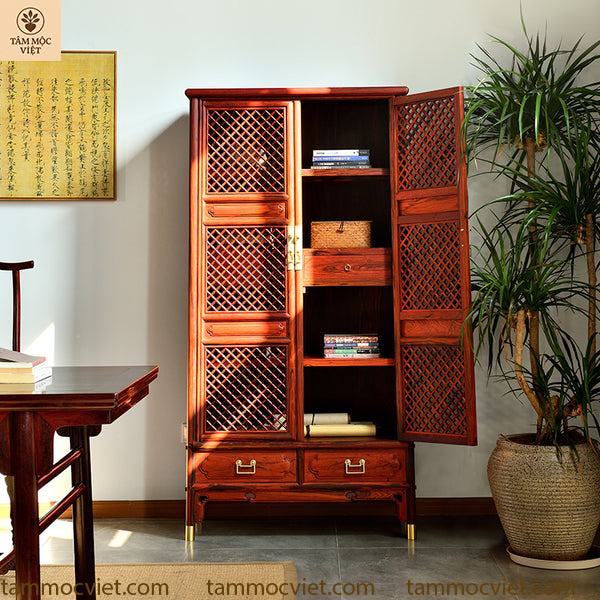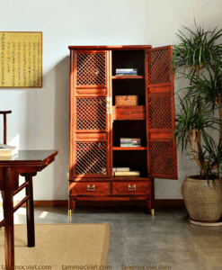 Không chỉ là nơi lưu trữ, tủ decor cao cấp gỗ hương còn đóng vai trò như một tác phẩm nghệ thuật sống động. Thiết kế cổ điển kết hợp với màu gỗ sáng tự nhiên giúp sản phẩm dễ dàng hòa quyện với nhiều phong cách nội thất: từ Á Đông truyền thống, Nhật Bản tối giản đến phong cách Indochine hiện đại.