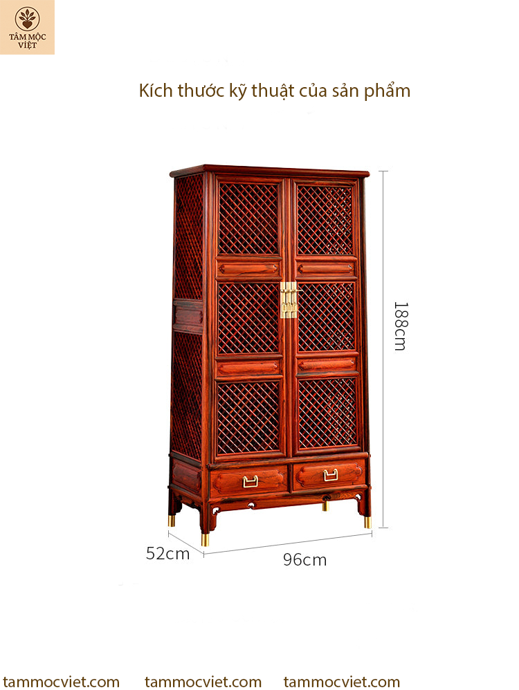 Tủ decor cao cấp gỗ hương có kích thước 188cm (cao) x 96cm (rộng) x 52cm (sâu), vừa vặn cho nhiều không gian khác nhau như phòng khách, phòng trà, thư phòng hay không gian làm việc. Với thiết kế 2 cánh cửa dạng lưới mắt cáo, sản phẩm tạo cảm giác thông thoáng, giúp dễ dàng quan sát các vật dụng trang trí bên trong mà vẫn đảm bảo an toàn, kín đáo.