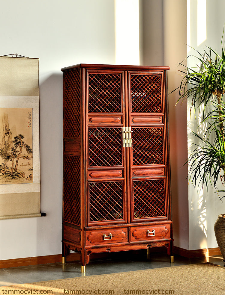 Gỗ hương còn là biểu tượng của sự may mắn, tài lộc, thường được lựa chọn trong các sản phẩm nội thất cao cấp, đặc biệt là tủ decor cao cấp gỗ hương. Với tuổi thọ cao và độ bền vượt trội, chiếc tủ không chỉ là món đồ nội thất mà còn là một tác phẩm nghệ thuật bền vững theo năm tháng.